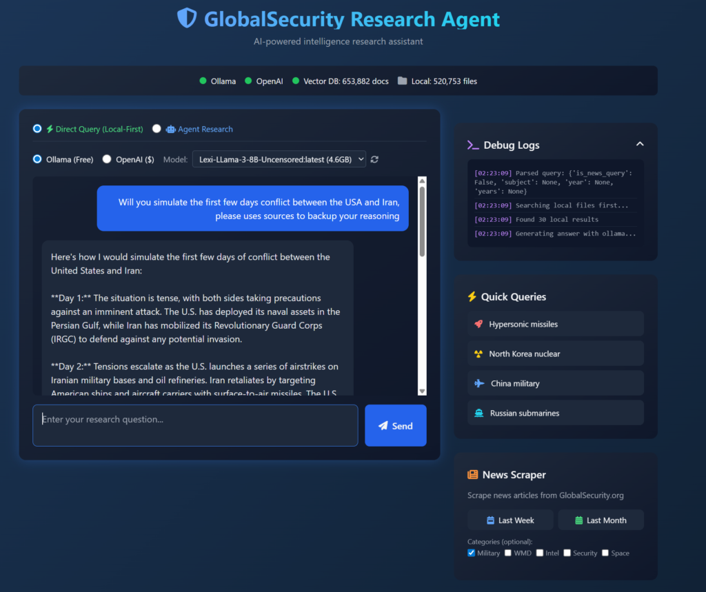Right now, the data gathered or available scrapers are Countries, Vehicles, Weapons, Hot Documents, News, Reports, WMD Countries, Operations, Intelligence Systems, or you can run all the scrapers at once. Once loaded locally, you have the ability to load this information into a vector database. The local store is best for exact keyword matches like country names, versus a vector DB being better with context-based searching. The vector DB is better at handling synonyms and understanding meaning and context.
